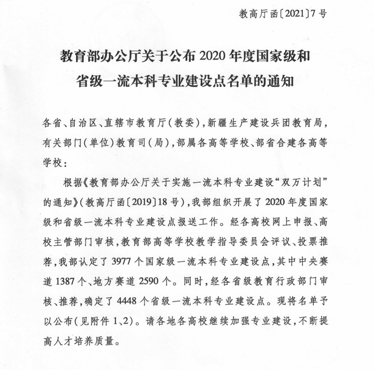 近日,教育部办公厅公布2020年度国家级和省级一流本科专业建设点名单(教高厅函〔2021〕7号),中文字幕机械设计制造及其自动化专业入选2020年度国家级一流本科专业建设点!!!